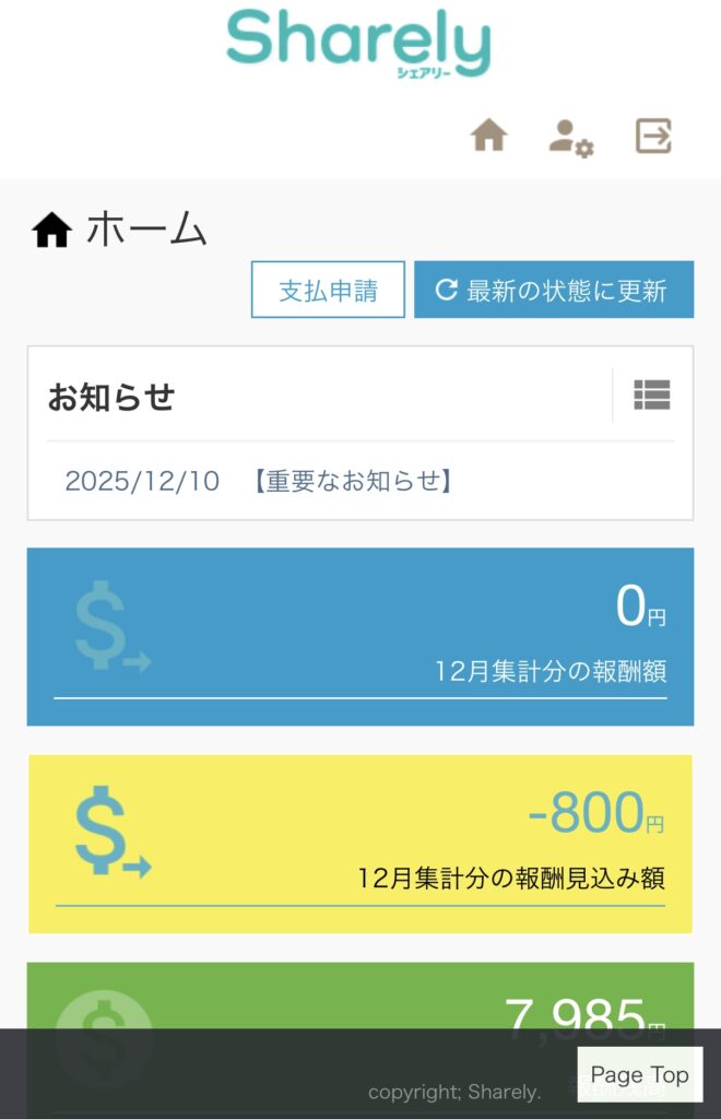 | 〇月集計分の報酬額 | 当月集計済みの報酬額(現在月の1日~月末までに発生) |